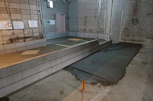 店舗内装工事日記江東区 精肉店 内装工事4 シンダー打設をしました。 生コン車を裏口に付け、フレッシュコンクリートを流し込みます。 シンダーを打つ前にスタイロフォームを100mm敷いてかさ上げし、メッシュを敷いておきました。 生コンを流しながら、床の表面を整えてゆきます。 少し時間をおいてからもう一度表面を整え、 乾燥を待ちます。 売り場側の床下地調整も同時に行いました。 江東区 精肉店 内装工事3 浦安 BAR INOHANA