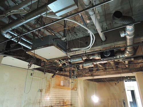 店舗内装工事日記豊島区 調剤薬局 内装工事3 工事が進んでおります。 解体後に出てきた土間床の状態の悪い所を下地処理します。 Before After 長尺シート仕上げなので、モルタルでしごいてハツリをして床を平らにならしました。 エアコンの取付も行いました。 今回は天カセエアコン4方向吹き出し口の一つを別室に吹き出しユニットを設置してダクトで繋げる工事です。 相模原 リハビリテーション 内装工事 4 最近の店舗・オフィス用エアコン