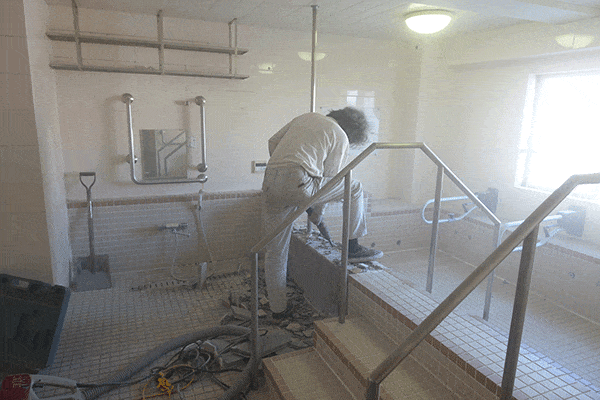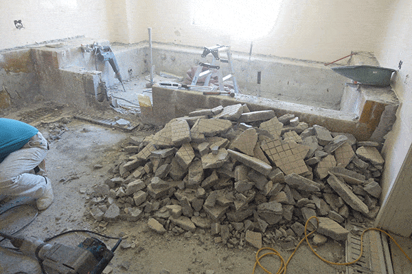 店舗内装工事日記横須賀市デイサービス 内装工事 1 工事が始まりました。 まずは既存浴室の解体です。 現場は鉄筋コンクリート造の2階に位置しタイル貼りの浴槽や洗い場をハツり構造躯体の床や一部天井が見える状態までこわしていきます。 青空と断捨離と もみじライン
