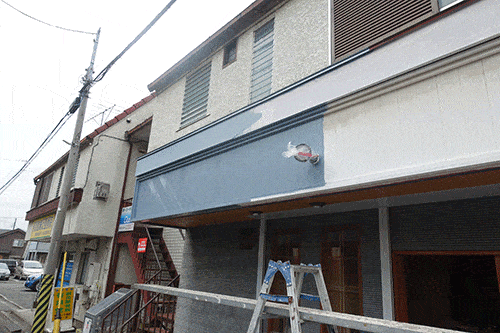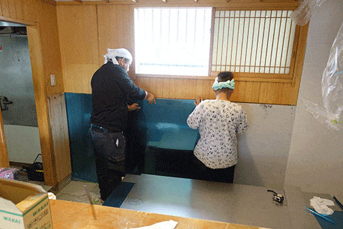 本日は、厨房の換気設備の取付と壁のステンレス板貼り