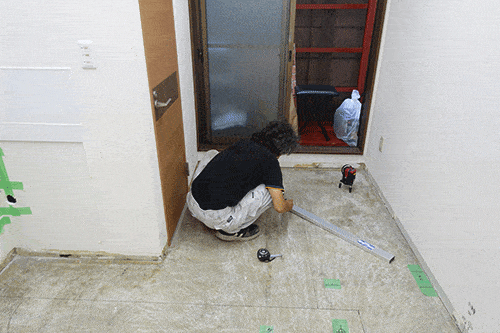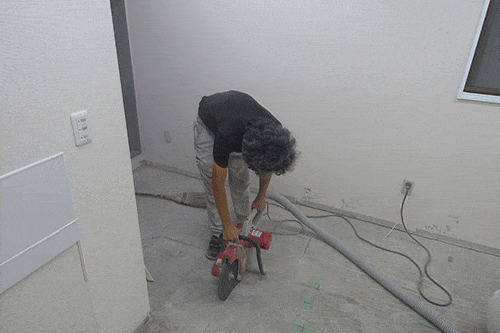 店舗内装工事日記川崎市 新丸子 ベーカリー 内装工事 2 金曜日に既存の床材が剥がされたので 本日は、給排水配管敷設の為にコンクリートをハツる為の 墨出しとカッター入れを行いました。 計画図面に基づき、現地床に配管の位置とハツリ範囲を落とし カッターを入れていきます。 慣れちゃダメ 相模原市 橋本 デイサービス 内装工事10