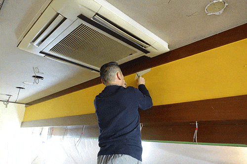 客席エリアは、既存クロスの剥がし作業が始まりました。