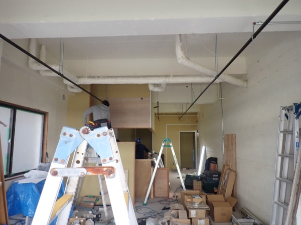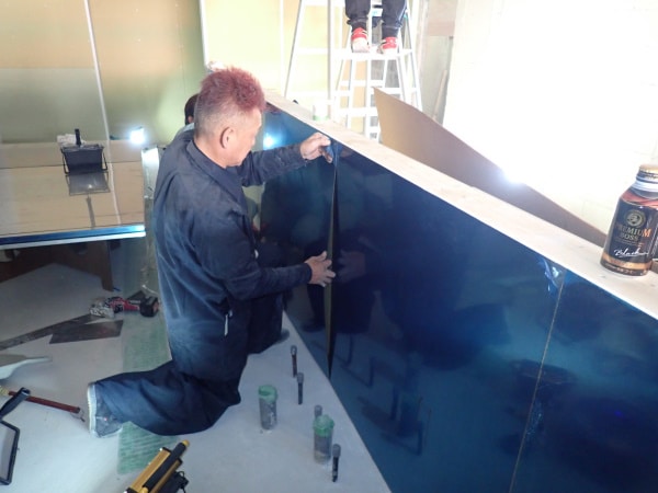 本日は、厨房壁のステンレス貼りフロントサッシの据え付け