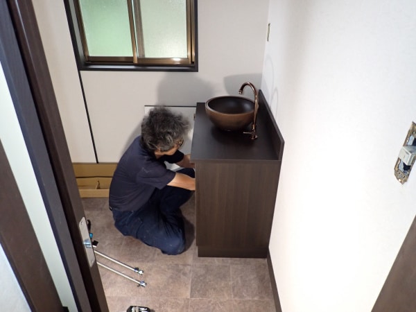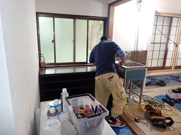 手洗いや流し、下駄箱等が据えられていきます。