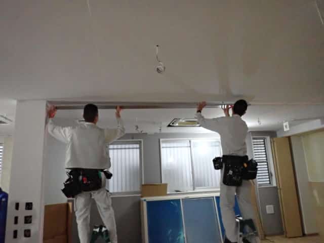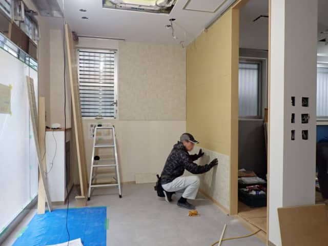 店舗内装工事日記町田 オフィス 改装工事 8 クロス工事が終わり、 入口付近の壁に今回エンボス調の壁を大工さんに張って貰っています。 取り外ししていた神棚の設置も行います。 同時に間仕切り引戸を設置していきます。 相模大野 洋菓子店 内装工事 5 一面の窓から景色を楽しめる!待ち時間にもくつろげる店舗デザインの美容室