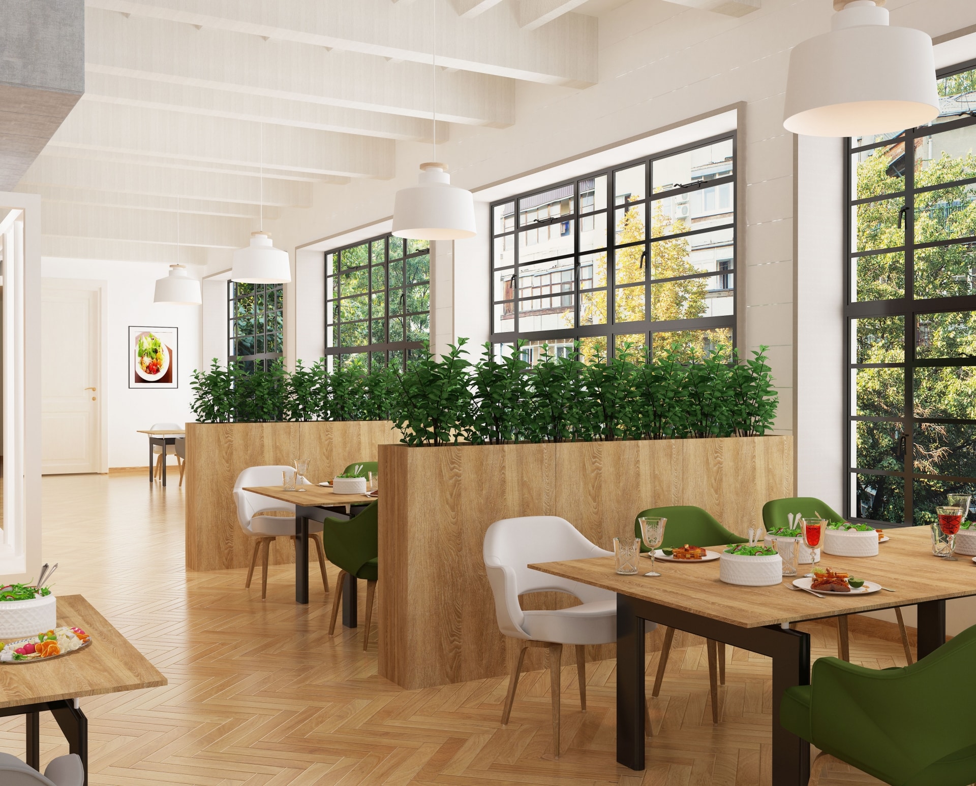白は光を反射するため、空間を明るく広く見せる効果があります。限られたスペースでも、開放的なカフェを作ることができます。天井や壁を白くすることで、圧迫感を軽減し、広々とした空間を演出できます。