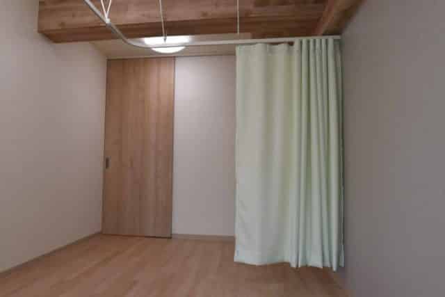 設計(レイアウト)は、保健所の事前相談で、天井まで仕切る様に指示された為、壁で施術室を仕切る事も考えましたが、エアコンの風が回らない、狭くなる等の問題があり、壁で仕切らず天井までの扉で仕切って圧迫感を感じさせないように工夫しました。原状回復の際に壁を解体する必要が無いため、費用が少なく済むメリットもあります。