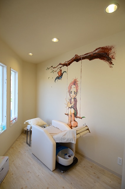 店舗、美容室・サロン町田 ネイルサロン nene 美容室アミさんのすぐ近くにオープンした姉妹店のネイルサロンです。店内壁面にはオーナーさんのお知り合いのイラストレーターの方が絵を描いてくださいました。白を基調にしたハワイテイストの入り口のドアは、アンティーク風のペイントで仕上げています。 物件内容:鉄骨造 24㎡/7.3坪 竣工:2011年9月 横浜 高座豚手造りハム あざみ野店 町田 美容室bleu(ブルー)