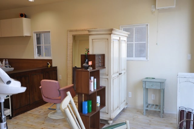小さなお子さま連れでも安心なキッズコーナーを備えた美容室です。古いサッシ窓はエイジング加工をした小窓で隠しアクセントにした。お施主様セレクトのビンテージ家具が白い内装で引き立っています。外から見るとインテリアショップのようですね。