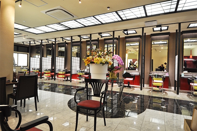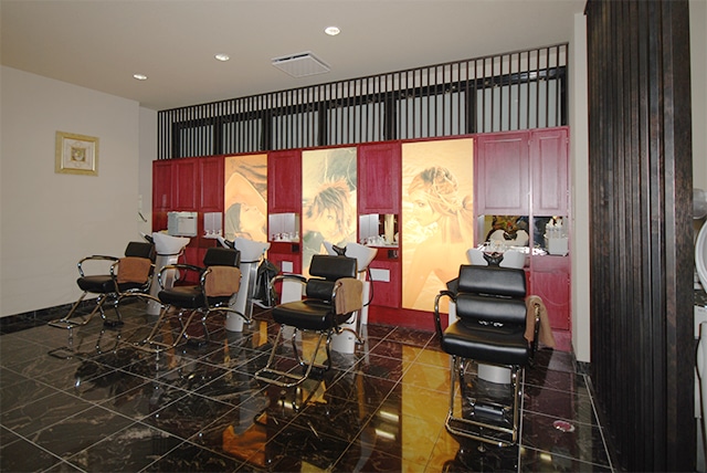 店舗、美容室・サロン聖蹟桜ヶ丘 美容室 びよう 『和』のイメージの野点傘や毛氈を思わせる黒の格子や赤い腰壁。一方床は大理石や御影石をふんだんに敷き詰めて『洋』の高級感のある仕上がりになってます。広々とした空間に和と洋がうまく調和しました。 物件内容:鉄筋コンクリート造1階部分 190㎡ / 57坪 竣工:2008年11月 立川 salon de SM.C 町田 ヘアサロン 心