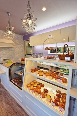 真っ白な外観と内装が印象的なベーカリーです。ラベンダー色を使いたいというお施主様の希望で売り場正面の壁と天井クロスに取り入れました。吊り戸棚の上下に仕込んだ間接照明で、店の外からもラベンダー色が際立ってよく見えます。真っ白の中にも壁の面ごとに色や柄を変えたり、エイジング塗装の板張りにしたりと変化をもたせています。甘すぎない大人かわいい内装になりました。