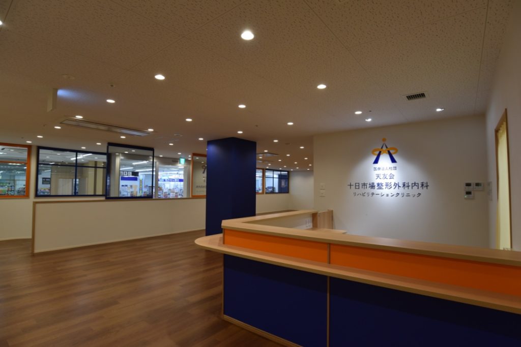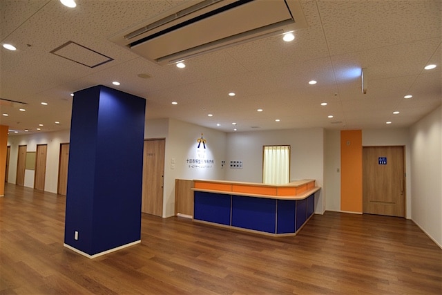 整形外科治療のほか特にリハビリテーションにスペースを広く取ったレイアウトになっています。院内は給排水配管のため25cm床あげをしたので入り口から緩やかなスロープをあがります。院内は段差無し、幅広引き戸、バリアフリートイレ、手すり設置。呼び出しのマイク、診察順番の表示モニター、精算機等弱電配線の配管も床下に縦横にわたっています。またレントゲン室は重い機器を設置するため鉄骨で櫓を組んだり、1枚約50kgの鉛板を天井や壁に貼ったりと、外側からは見えない部分での大変な工事過程がありました。内装デザインは明るい木目柄をベースに、医療法人のテーマカラーであるオレンジとブルーがポイントになっています。クロスや建具の一部に差し込まれたカラーは自然と活力が湧いてきます。50mに渡る長いスパンの壁を交互に並ぶ2色の窓枠がリズミカルに演出しています。リハビリ室側の窓はプライバシーに配慮しながらも閉鎖的にならないように柄デザインのシートをガラスに貼ってあります。外から動きの気配がわかります。