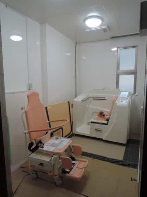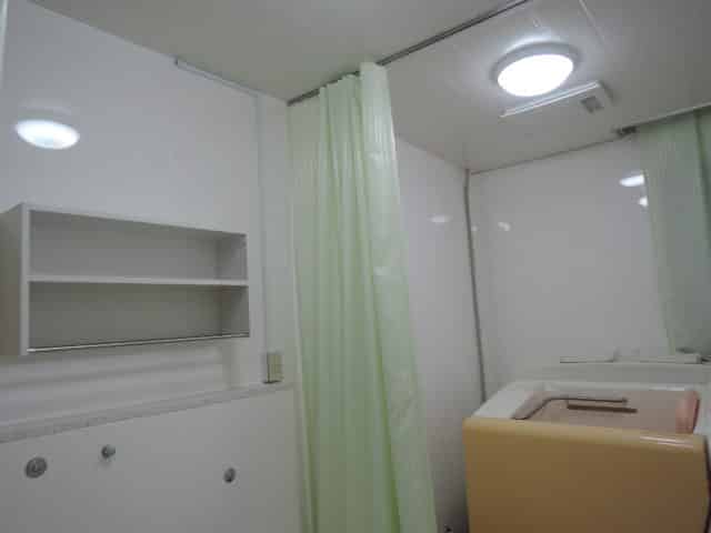 介護・医療施設忠生 デイサービス浴室改装 限られた狭小空間でも動線が取れること、介護者の方々が出来るだけ負担のない操作が出来る機器であることなどを考え、個浴タイプでコンパクトな入浴機器を導入しました。それでもスペースはぎりぎりですが、元々あったサッシを撤去し、シャワーカーテンで間仕切りをするなど、車いすが動きやすく患者様にとってもストレスの少ない空間づくりを目指しました。 町田 美容室 江東区 精肉店 内装工事1